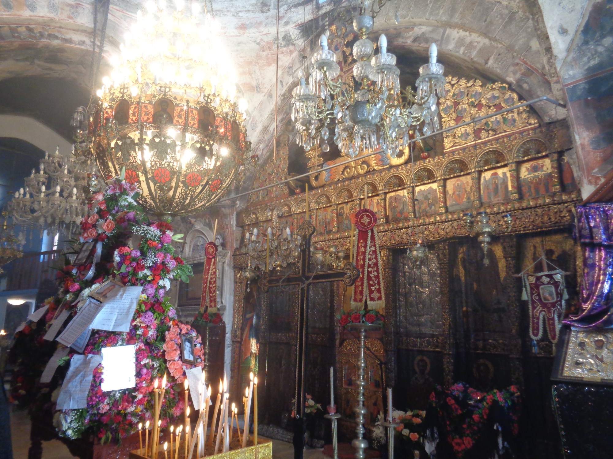 Non ! Μαρία revient vers moi, me confie l’encensoir et m’invite à faire le tour de l’épitaphios. Je m’exécute, sans trop savoir ce que je suis en train de faire, comment je dois le faire et si j’ai bien le droit de le faire. La jeune-fille qui a pris soin de mes poumons, les Karpathiennes en habits colorés, le foulard noir à fleurs rouges et vertes sur la tête, me regardent avec bonhommie, sans doute ont-elle pitié de moi…. Je fais le tour de la chasse le plus dignement possible, je surveille l’encensoir entre mes mains et je remarque au milieu des fleurs d’oranger et de citronnier des photos, des lettres d’enfants et des messages épinglés. Ce sont les portrait des personnes qui sont mortes pendant l’année, m’explique la jeune-fille toujours à côté de moi. Je confie l’encensoir à la personne qui attend et je sors de l’église. Cette fois-ci, j’ai bien laissé Maria en train d’accomplir toute seule les rites. Il ne reste plus qu’à quitter le village, après avoir grimpé jusqu’aux moulins comme autant de canons pointés sur les dernières maisons. Les nuages descendent et tourbillonnent au dessus des montagnes, les transformant pour quelques minutes en volcans crachant leurs fumerolles.( συνέχεια / à suivre)