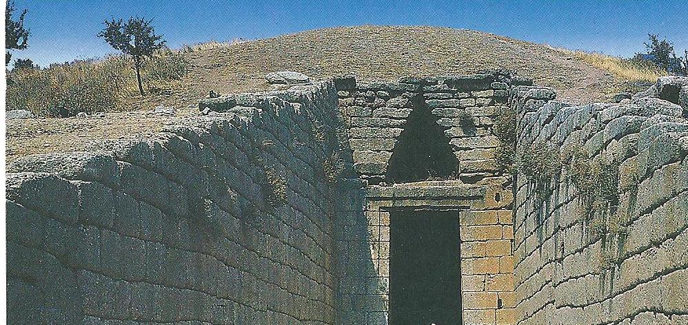 Quand le linteau d’une porte est trop lourd, comme c’est le cas de la porte des Lionnes à Mycènes, il risque de céder et de s’affaisser. Alors l’architecte ménage, au-dessus de la porte, un triangle vide destiné à répartir les forces, à soulager la structure et à consolider l’ensemble. A ce point de vue, l’entrée monumentale qu’est la porte des Lionnes est tout à fait remarquable. Ce sont quatre blocs de pierre d’une vingtaine de tonnes chacun. Une plaque, sculptée de deux lionnes dressées face à face, comble le triangle de décharge pour le dissimuler. Par contre, le vide triangulaire de l’entrée de la tombe d’Agamemnon est resté bien apparent et la solidité de l’ensemble lui doit tout !