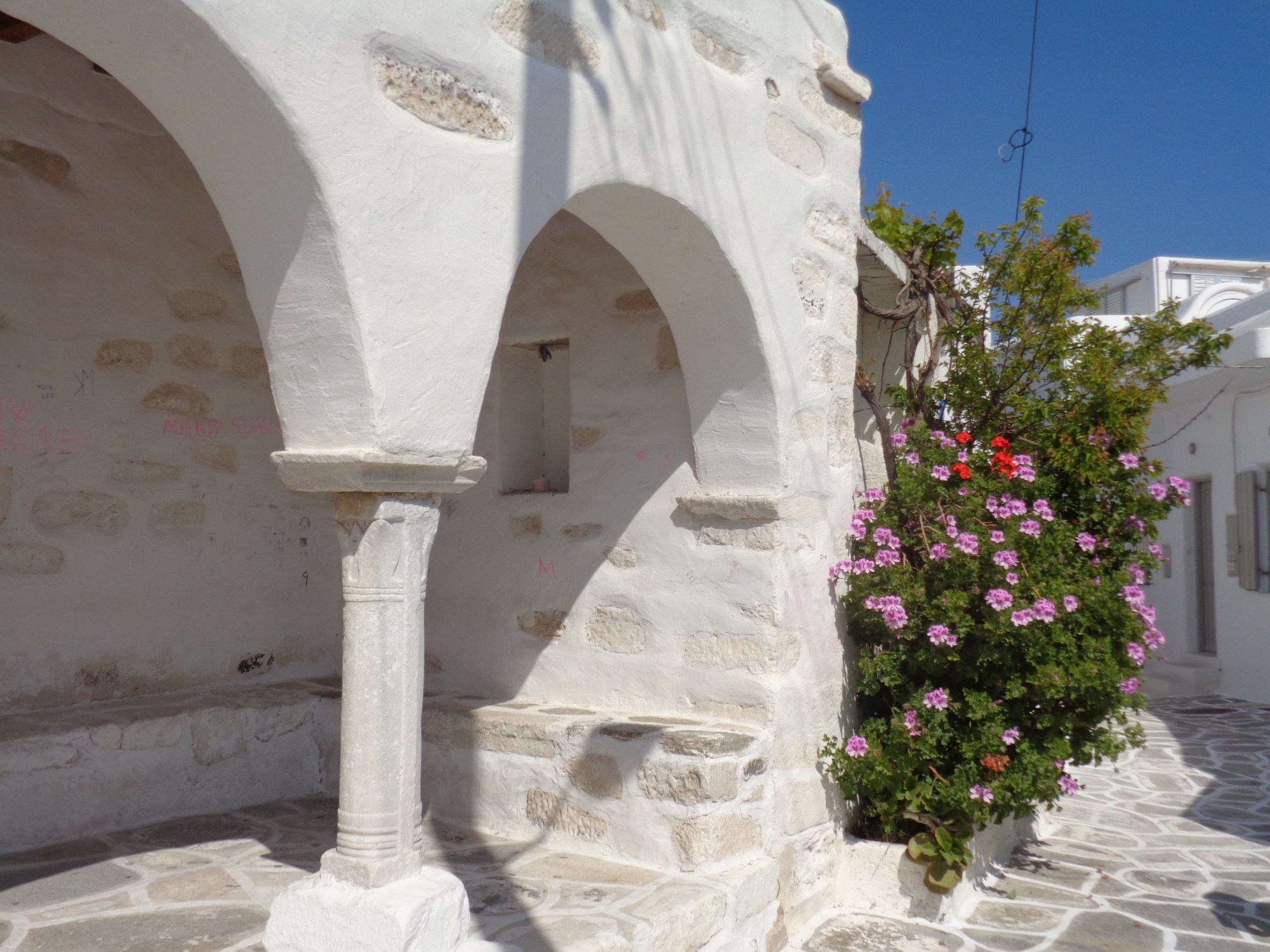 Paros, à l’angle d’une rue de Paroikia et à côté d’un énorme géranium, une colonne antique de style corinthien soutient le toit d’une terrasse avec de belles arcades. La maison y gagne un petit air aristocratique et original. Un air de dire : « Regardez comme cela fait chic ! ».