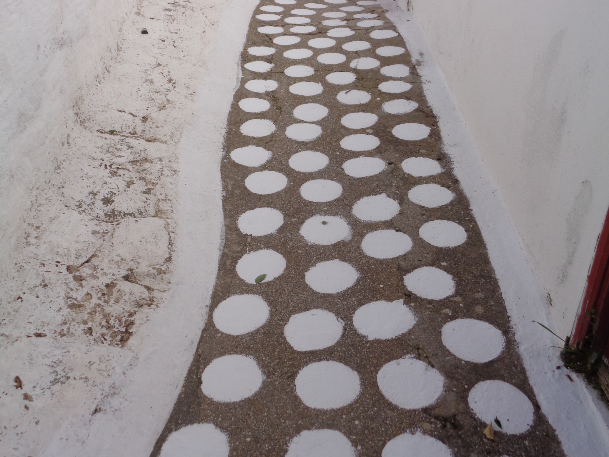 ….qui en a assez de quadriller à la peinture blanche sa ruelle, de dessiner des carrés bordés de blancs, au milieu desquels les passants sont censés poser le pied. Car au début on essaie de respecter cet ordre tacite, édicté par des Grecs soucieux de propreté et d’ordre, mais très vite la rapidité du pas ne s’accorde pas avec les quadrilatères à la forme quelquefois fantaisie, qui sont plus ou moins alignés… Le déséquilibre aidant… en fait le pied, on le pose n’importe où ! Finalement quelqu’un a décidé que les carrés c’était inutile, fini … et que dorénavant il optait pour des pois !
