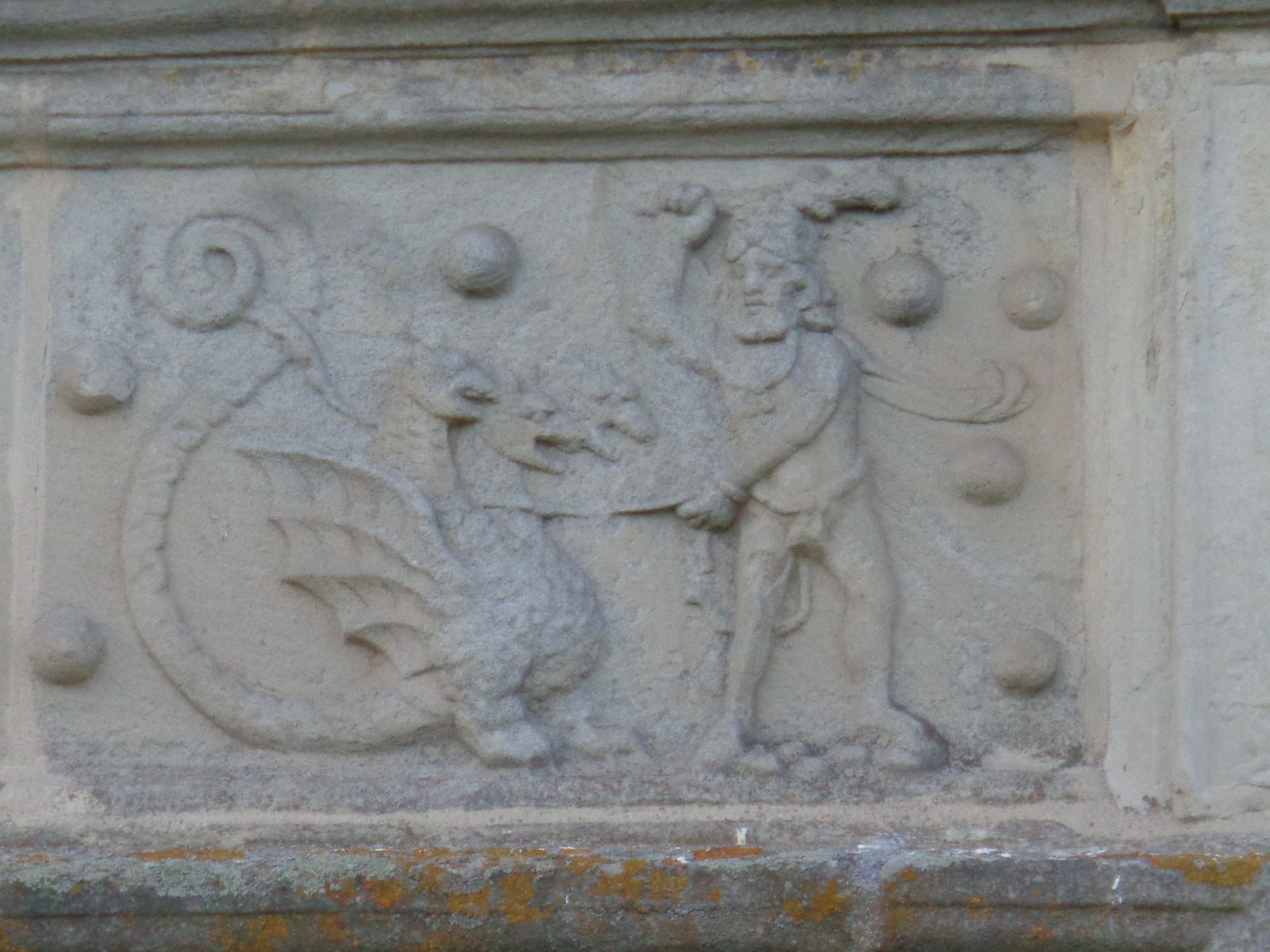 Où que l’on visite un monument historique, on rencontre des représentations du mythe d’Héraklès. Le bâtiment restant sur le quadrilatère du château d’Assier, construit par Galiot de Genouillac au XVI° siècle dans le Lot, le confirme. Sur la façade Renaissance figure un bas-relief en calcaire représentant Héraklès tenant en laisse et menaçant de son gourdin un dragon à trois têtes à la longue queue gracieuse, sans doute l’hydre de Lerne. Le mythe d’Héraklès peut subir quelques coups de canif au fil des siècles…. car si l’on reconnaît bien le héros, on est un peu surpris des petits mamelons dispersés dans la scène. Il s’agirait des boulets de canons tirés vaillamment par le Maître d’Artillerie Galiot de Genouillac venant en aide à François I° lors de la bataille de Marignan. En quelque sorte, ce panneau raconte comment au XVI° siècle le Maître d’Artillerie de François I° a aidé Héraklès à terminer – propre et bien – l’un de ses 12 travaux …. Mythomane ? Galiot de Genouillac ….