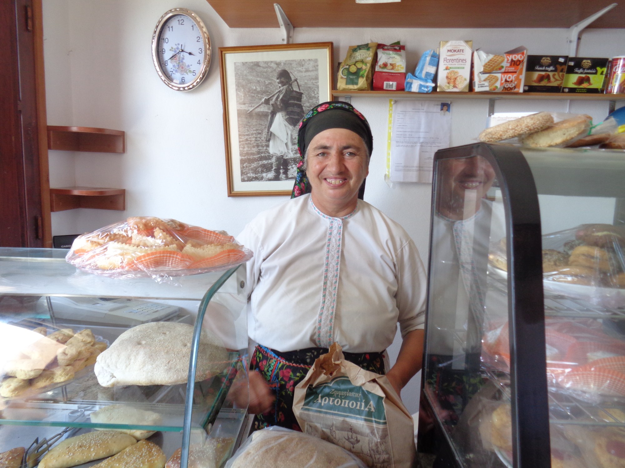 Petit village dans les hauteurs, petite boulangerie sur une placette -presque un couloir- devant un panorama à couper le souffle… Les panneaux indiquant la direction du magasin ressemblent à un gag. Au début il y en a beaucoup, la flèche penchée dans des directions différentes. On monte des escaliers, on en descend, on tourne à droite, puis à gauche, puis encore à droite et là, c’est sûr on est perdu ! Et évidemment, il n’y a plus de panneaux …. Qu’est-ce qu’on fait ? On rebrousse chemin ? On continue ? On ne pourra même pas dire qu’il n’y avait pas un chat pour nous renseigner… Un chat se faufile entre les jambes, on se penche, on le caresse … et on voit une marque par terre avec une flèche dessinée à la peinture : « Αρτοπωλείο ». Encore quelques marches, des passages si étroits qu’on se demande comment font les clients… Quand je le demande à la boulangère, elle me répond avec un grand sourire : « Il faut passer par l’autre côté, on peut venir en voiture ! »
