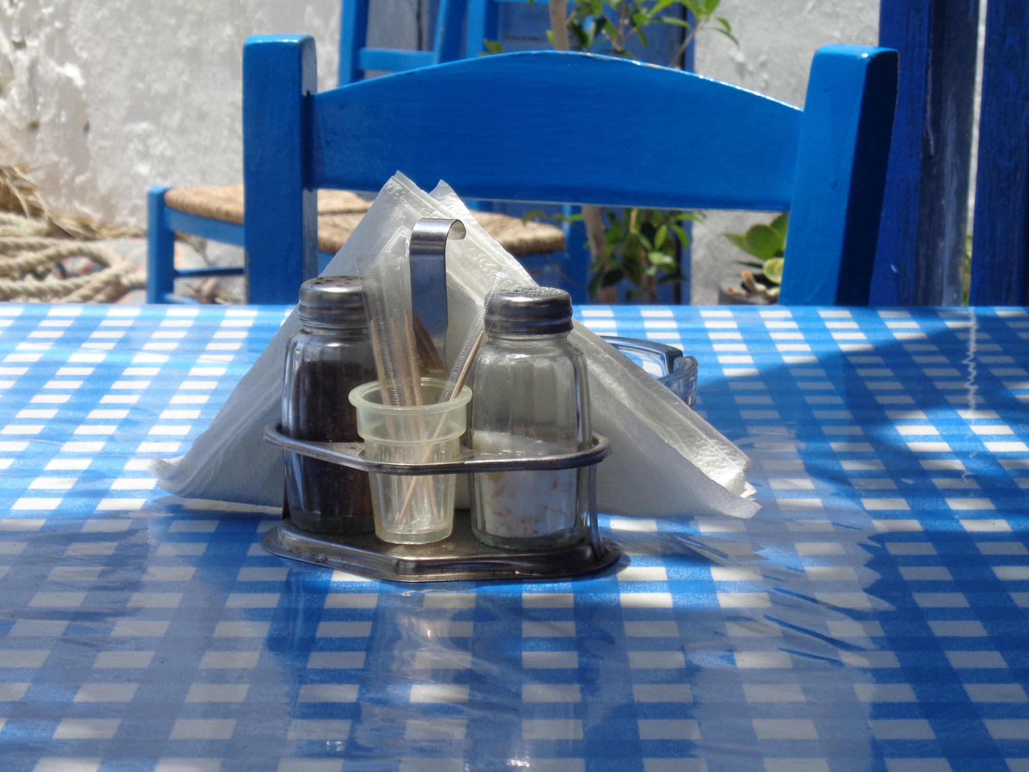 Manolis du Ψηλορείτης me repère de loin dans la rue. Il nous hèle bruyamment et, sans attendre que nous passions devant sa taverne, nous salue depuis le trottoir d’en face. C’est vrai que nous sommes de bons clients ! Chaque soir nous emportons un plat cuisiné par ses soins, qu’il me remet soigneusement enveloppé de papier d’alu. Il ne manque pas d’y rajouter gobelets, couverts en plastique et χαρτοπετσέτες. Je n’ose pas lui dire que nous avons tout ce qu’il faut à la maison… Invariablement la main sur le coeur, il m’assure qu’il a fait comme pour lui, comme pour sa famille … et je le crois. C’est que ma smala l’amuse, le touche et il se prend au jeu ! Je suis encore à 5 mètres de lui qu’il me propose : « Qu’est-ce que je vous fais ce soir ? 5 douzaines de souvlakia, 20 gyro, une grande plaque de moussaka ? » Comment dire non à tant de gentillesse ? … et puis, on ne vient pas en Grèce pour manger des chips !