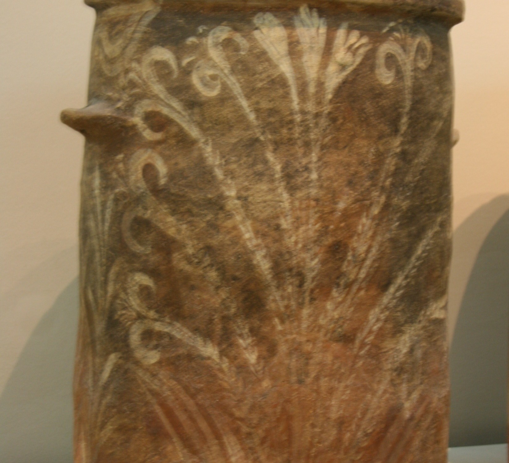 Photo: Santorin, Akrotiri. Jarre cylindrique aux fleurs de lys. (c) tous droits réservés à GP.