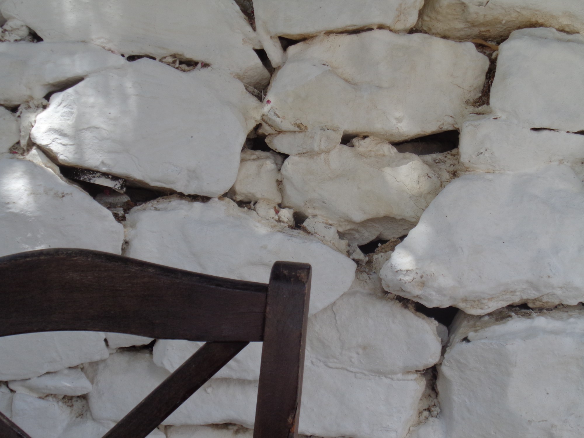 A Naxos, dans ma chambre d’hôtel, je remarque juste au-dessus de mon lit un cache en plastique blanc, en plein milieu du mur. Croyant découvrir une caméra espionne ou je ne sais quoi encore, je touche de la main le cache qui s’enfonce dans la cloison et tombe dans la chambre d’à côté …. Avec ce que j’ai dans mon sac, i.e. sparadra et mouchoir en papier, j’obture le trou comme je peux ! Mais il faut bien le dire… un trou béant, large d’une dizaine de centimètres, est resté dans le mur.