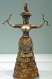 Au II° millénaire, de nombreuses statuettes minoennes en terre cuite représentent des femmes sur un socle figurant une jupe, en particulier la Déesse aux bras levés, retrouvée à Gazi et exposée avec ses copines au musée d’Héraklion. Elles ont un geste stéréotypé assez éloigné de la posture naturelle et des bras sans vraisemblance anatomique. Certains y ont vu une ressemblance avec les cornes minoennes …. On s’accorde du moins à dire que ce geste de salutation symbolise la prière ou l’invocation. Mais la plus connue est sans doute la Prêtresse aux serpents retrouvée à Gournia. Savez-vous qu’elle a une jumelle ? Une prêtresse dont les serpents font comme de très longs bracelets ? Ces deux statuettes de petite taille en faïence devaient elles aussi avoir un socle car on a retrouvé les coquillages qui l’ornaient….. Les Prêtresses aux serpents portent le vêtement crétois : jupe large et longue, tablier et corsage étroit qui laisse la poitrine découverte et sur leur tête une tiare ornée de serpents avec – un peu curieusement- une panthère au-dessus. Si leur représentation nous donne une idée bien concrète de la mode du temps au palais de Knossos, il est plus difficile d’expliquer la position de leurs bras. D’autant qu’il faut avouer tout de suite que la seconde statuette, celle qui a les bras entourés de serpents … éh bien … elle baisse les bras, et même elle les tient droit devant elle dans un geste théâtral ! Il est certain que les deux statuettes en faïence trouvées à Gournia sont d’une autre facture que leurs copines de terre cuite. Brandissant un serpent dans chaque main ou exibant un bracelet de serpents dans un geste assuré et triomphant, elles sont plutôt des dominatrices -d’où le nom de prêtresse- que de simples suppliantes.