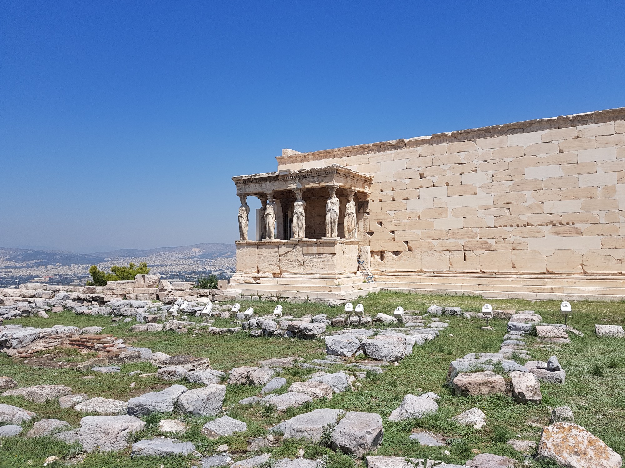 L’Erechthéion, temple en l’honneur d’Athéna et d’Erechthée édifié sur l’Acropole d’Athènes est un édifice gracieux et soigné. Malgré un terrain accidenté, des pentes de rocher et des différences de niveaux, l’architecte n’a effectué aucun remblai. Il n’a pas touché au terrain pour garder les signes « sacrés » : olivier sacré, coup de trident, tombeaux de Kékrops et d’Erechthée, nid du serpent sacré. On peut également admirer la sveltesse du portique Est, les nervures sculptées aux bases des colonnes, les palmettes sculptées de l’astragale -ornement au chapiteau des colonnes ioniques-, les volutes des chapiteaux -les spires recouvertes de bronze doré et les yeux des volutes d’or-, les polychromies des personnages en marbre blanc du Pentélique fixés sur du marbre noir d’Eleusis … et les 6 magnifiques Korés – les jeunes filles- appelées les Caryatides !