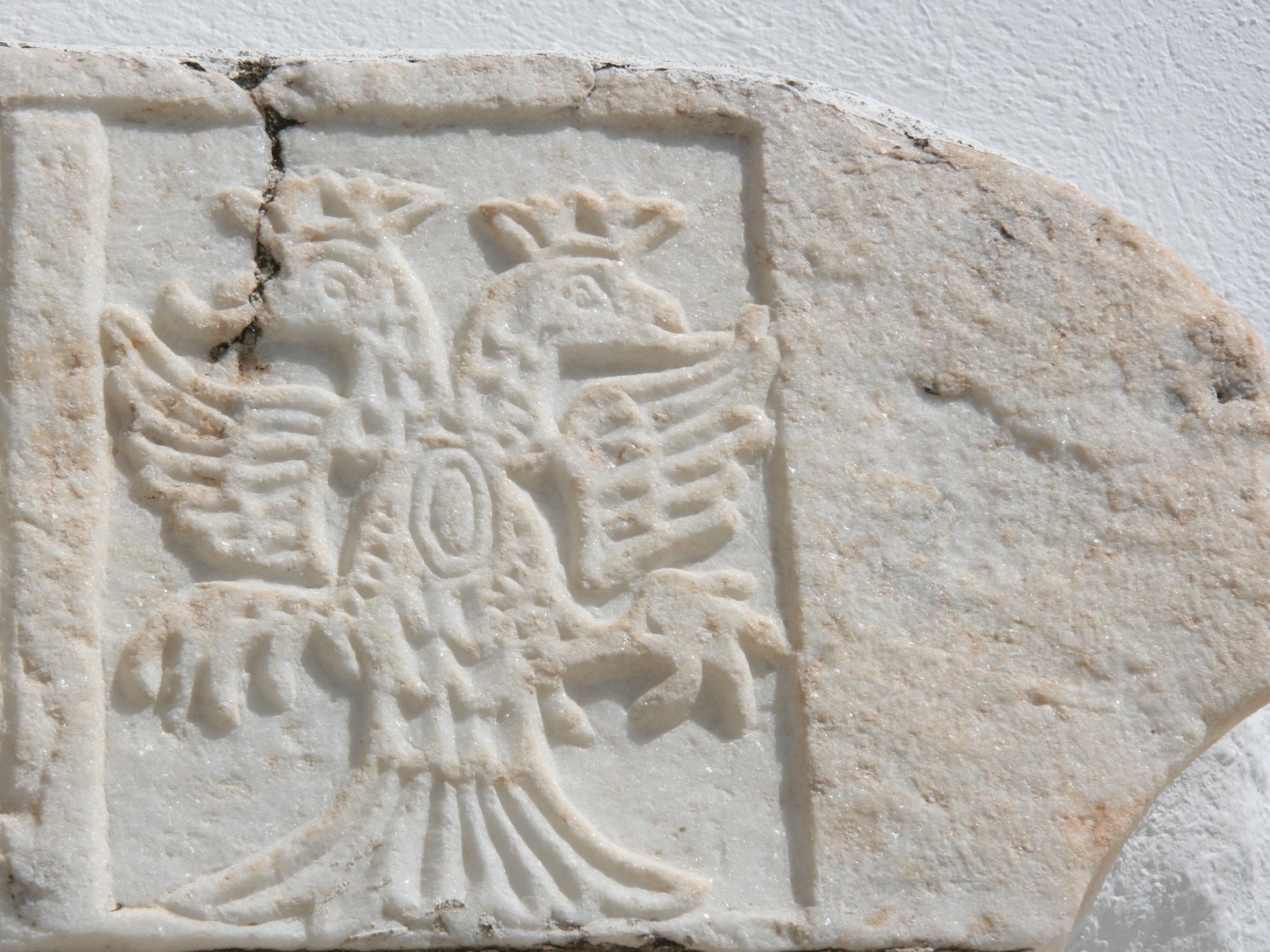 L’aigle est un motif bien connu des Grecs ( peut-être une réminiscence de l’aigle de Zeus ?..) car on le retrouve un peu partout et sur tous les supports : marbre, bois, fer…etc. Mais le chouchou, c’est l’aigle byzantin qui a la particularité d’avoir deux têtes opposées. On le sculpte sur les murs des édifices publics mais plus encore des édifices religieux, églises et couvents car il symbolise tout autant que l’état constantinopolitain la religion orthodoxe. En général, l’aigle bicéphale est représenté les ailes déployées et sous chaque serre une boule figure un globe terrestre. Sur les deux têtes se tient en équilibre une couronne. Les plumes de l’oiseau forment sur son ventre comme des écailles et plus curieusement sa queue lui sert de siège. Ce qui paraît aux touristes étrangers plus farfelu, c’est qu’on le retrouve à des endroits où il n’a, semble-t-il, rien à faire : sur les portails, les garde-corps des balcons, les appliques électriques, les canevas et les nappes, comme motifs de κροκαλιά (les cailloux décoratifs des cours, des seuils et des parvis) et encore sur les battants des portes des meubles. Il semblerait que sa seule présence ennoblisse la plus simple demeure…