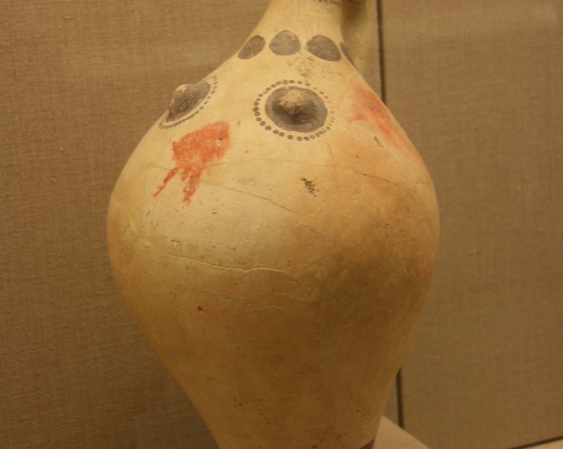 … sur des cruches, vous avez déjà vu ça, vous ? « -Oui, mais exclusivement dans les Cyclades ! » Comme les kymbès, sortes de petites baignoires dont on ne sait à peu près rien et les passoires bien utiles pour les tisanes… le vase à mamelons est l’exclusivité des îles centrales de la mer Egée avec une montée en puissance à Santorin. Une poterie blanche ornée de motifs floraux ou animaliers, des vases à la panse souvent renflée, un long bec effilé qui lève le cou comme une oie qui cancane, une petite anse ronde où l’on passe seulement deux doigts et une ou deux petites excroissances rondes sur le haut de la panse … ou ailleurs ! Ces bosses, que l’on a baptisées joliment « mamelons » car elles semblent figurer des seins, laissent tout de même perplexe. Visiblement elles n’ont aucune utilité fonctionnelle ni décorative quand elles sont disséminées sur le vase de façon qui paraît aléatoire. Il faut sans doute y voir, cependant, un hymne à la féminité/fertilité ou une prière pour que la cruche puisse toujours se remplir…