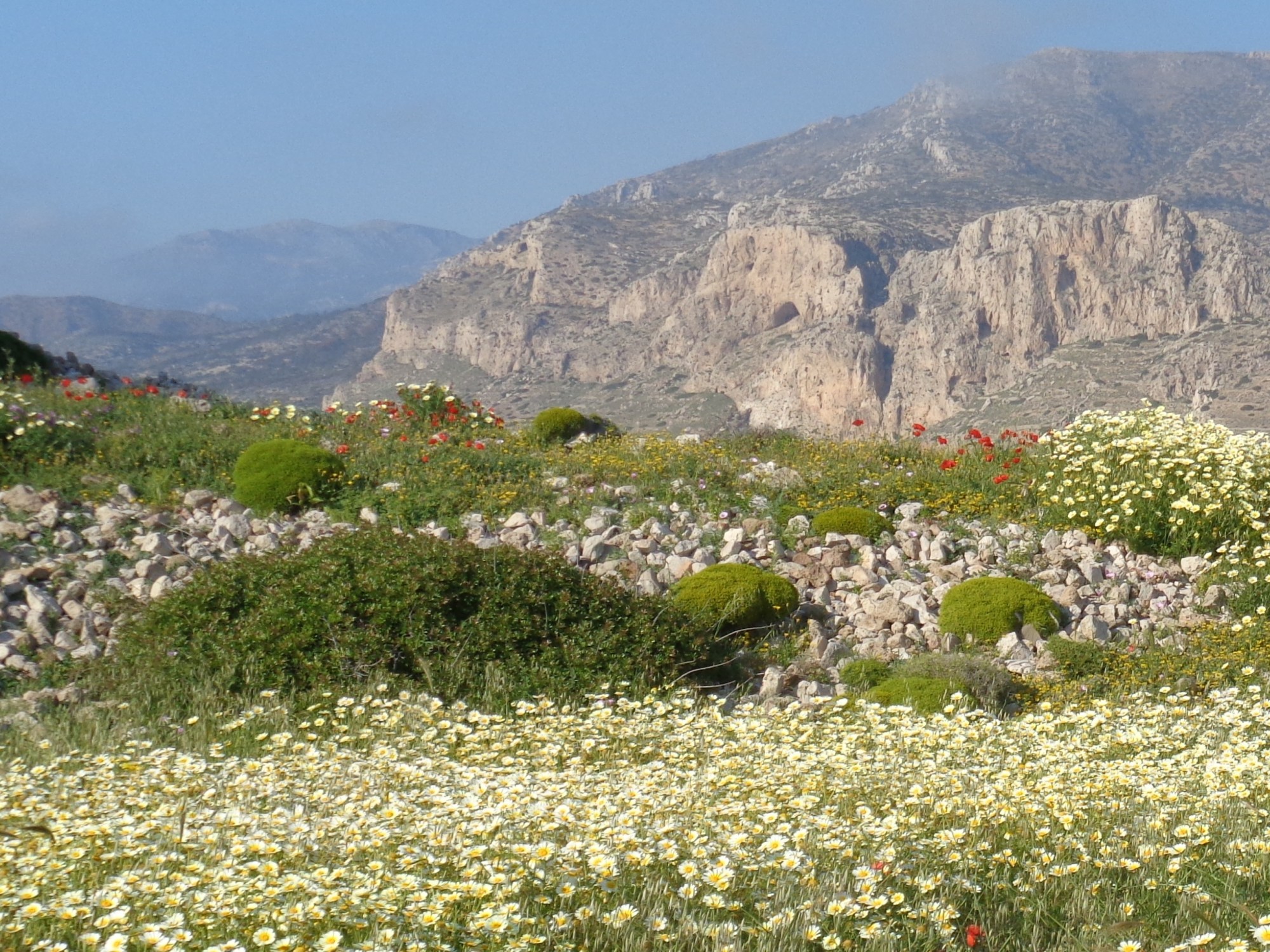 C’est toujours curieux et amusant de se référer à un texte antique pour arpenter la campagne grecque. Il ne s’agit pas, cependant, de tomber dans la monomanie et de chercher avec obstination et tous les 100 mètres l’emplacement du carrefour où Oedipe a tué son père Laïos, comme je l’ai vu faire par certains hellénistes acharnés ! Mais si je me réfère au texte des Géorgiques de Virgile à propos de l’île de Karpathos : « C’est là dans une grotte immense, au flanc d’une falaise rongée, où l’onde s’amasse, poussée par le vent et se brise en courants circulaires qui refluent, mouillage depuis longtemps, très sûr pour les marins surpris »… et que j’essaie de voir où pourrait se trouver la demeure de Protée qui gardait son troupeau de phoques…. Première déception, je n’ai jamais vu de phoques à Karpathos ! Mais peut-être n’ai-je pas bien regardé ?… En ce qui concerne les mouillages, ils sont actuellement sur la côte est, dans des criques qui déboulent de hautes montagnes et de routes en lacets. Mais je ne me rappelle pas y avoir vu de grotte, et puis si on y mouille les bateaux c’est justement parce que les eaux y sont à peu près tranquilles et sous le vent. Deuxième déception, pas de tourbillons vertigineux près des mouillages actuels. Tournons-nous vers la côte ouest, au vent et bordées de falaises vertigineuses sans accès. Là ça bouillonne, les flots tournent et virent ! Pas question de mouiller n’importe où. C’est soit à l’Ancienne Arkassa tout au sud de l’île et ça ne tomberait pas plus mal car nous avons affaire à une cité minoënne. De plus il y a des grottes pas trop loin de la mer… j’y caserais bien Protée… mais, soyons honnête, ça ressemble plutôt à des abris rocheux. Il y a encore le petit port de pêche assez sympa de Finiki, plus au nord Lefkos, et encore plus loin Vroukounda. Pour les mouillages et les remous tous ces endroits pourraient faire l’affaire… aussi, comme ce n’est pas la peine de chercher les phoques qui ne m’ont pas attendue, je cherche plutôt la grotte ! Et j’en trouve une qui me plaît bien ! On la voit parfaitement depuis la route côtière, à flanc de falaise, avec une entrée énorme. De-là, c’est sûr, on peut surveiller les phoques…Bon, vous allez me dire : Elle n’est pas un peu loin d’un mouillage ? Et puis comment Protée faisait-il pour descendre dans sa grotte ? En rappel ? Oh, et puis zut ! Allez-y voir par vous-même !