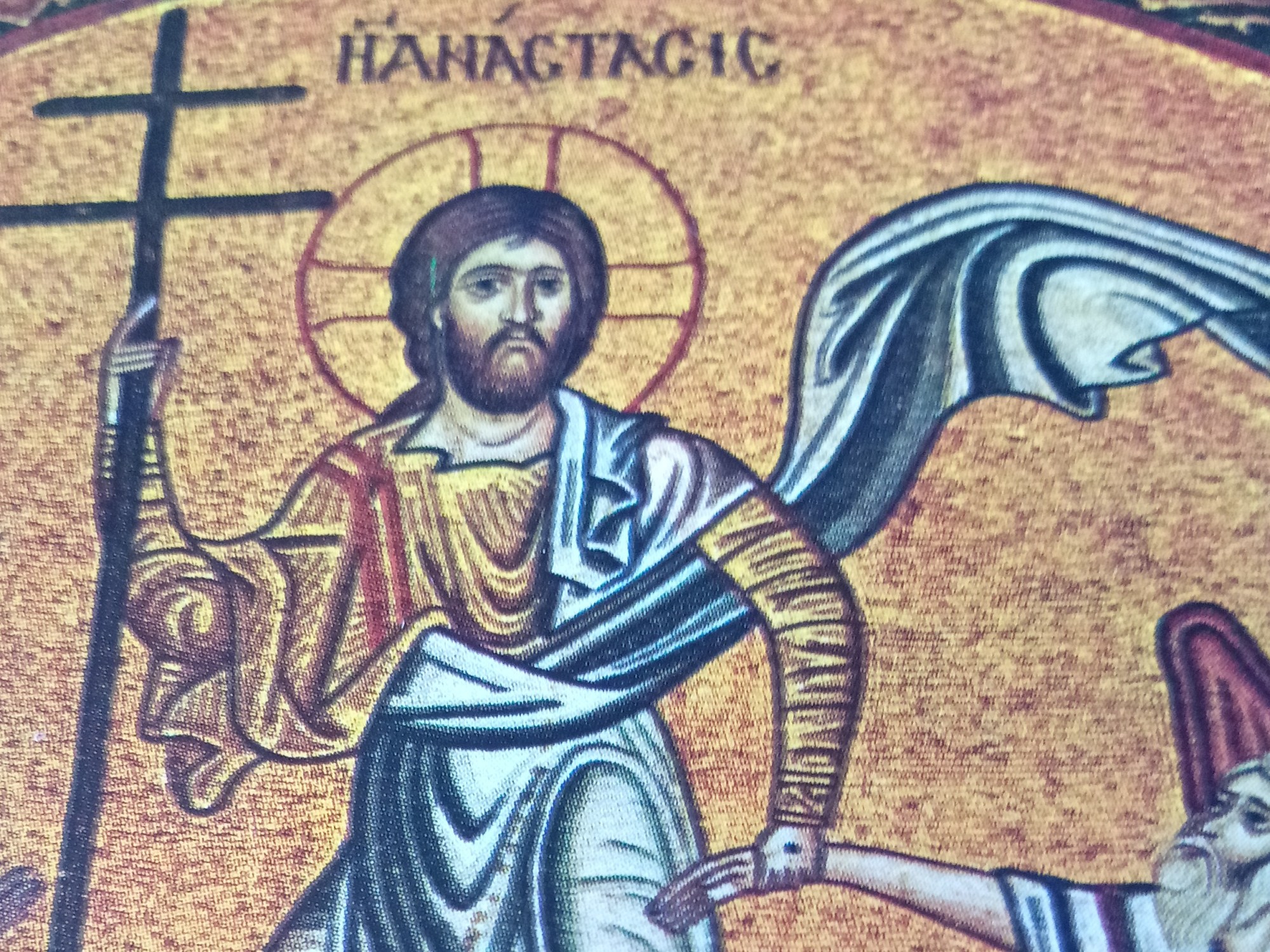 On a vu que quand le Christ est représenté en majesté sous le dôme des églises byzantines, il arbore un air qui n’incite pas au relâchement ! Il est tout différent quand les mosaïques le mettent en scène dans des situations « humaines », en fait quand il est seulement Jésus. Par exemple à Ossios Loukas dans la scène de la résurrection, son air dubitatif et attendri s’oppose à la main ferme dont il tient Lazare qui sort du tombeau. Notez que certains détails l’ancrent dans l’ humanité. Par exemple dans la représentation de la résurrection, au pied du Christ on distingue des verrous, des clés et des portes brisées, symboles de l’enfer qui attend le commun des mortels… et d’autres détails l’ancrent dans le divin, comme la croix inscrite dans son auréole. Ses représentations (mosaïques, fresques, icônes) supplantent celles de Dieu le Père qui sont plutôt de l’ordre du symbole (oeil, main…) respectant ainsi l’idée que le dieu n’a pas d’image.