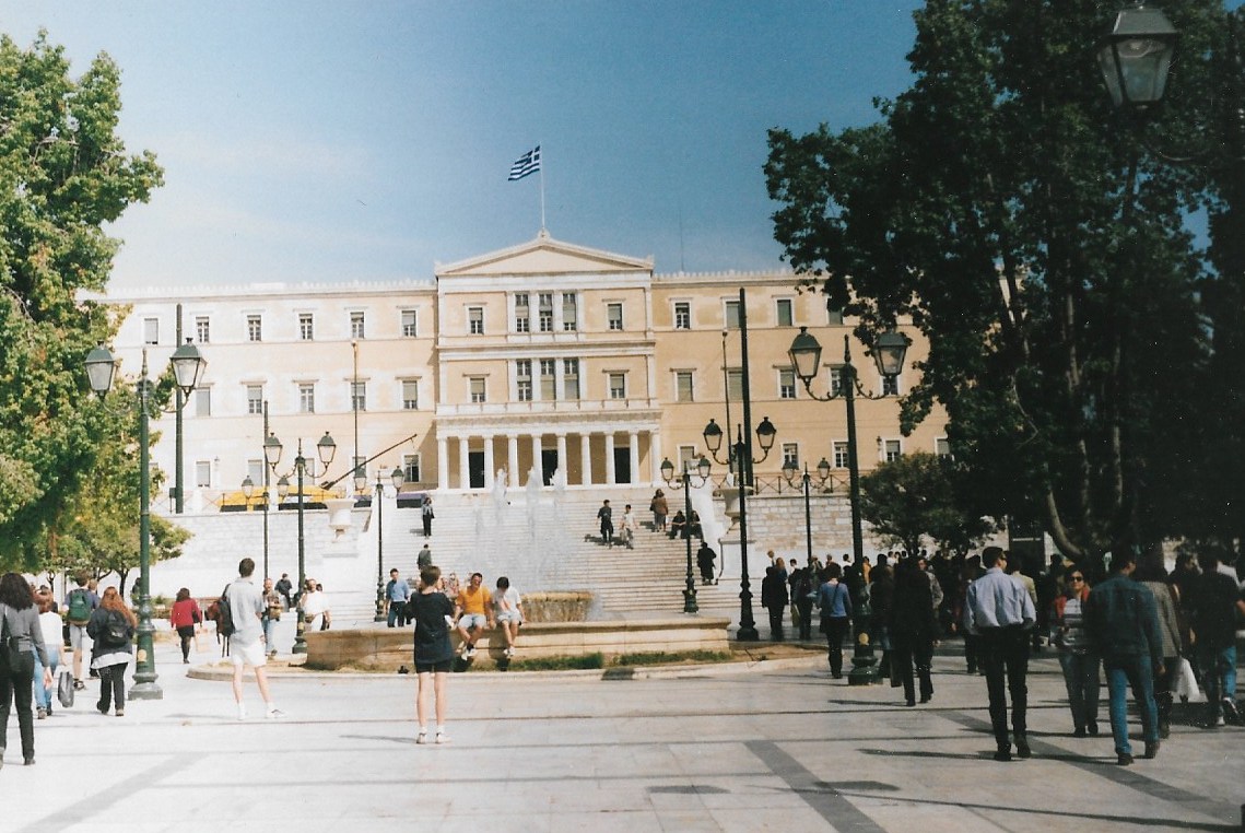 Nous savons exactement où se trouve Dimitri : sur la place de la Constitution avec le bâtiment du sénat en arrière-plan, devant le tombeau du Soldat Inconnu, où les evzones montent la garde, font la relève tous les soirs à 17h, et où ont lieu les cérémonies et parades militaires. Sur le mur sont inscrites toutes les batailles auxquelles les forces grecques ont participé. Nous sommes au coeur d’Athènes, entre les quartiers résidentiels et les rues commerçantes. Dimitri attend Myrthô et ne sait comment s’y prendre pour épier sa sortie de l’agence de voyages. Comme cela arrive souvent chez Maris et aussi dans la vraie vie, il va se réfugier dans un café.