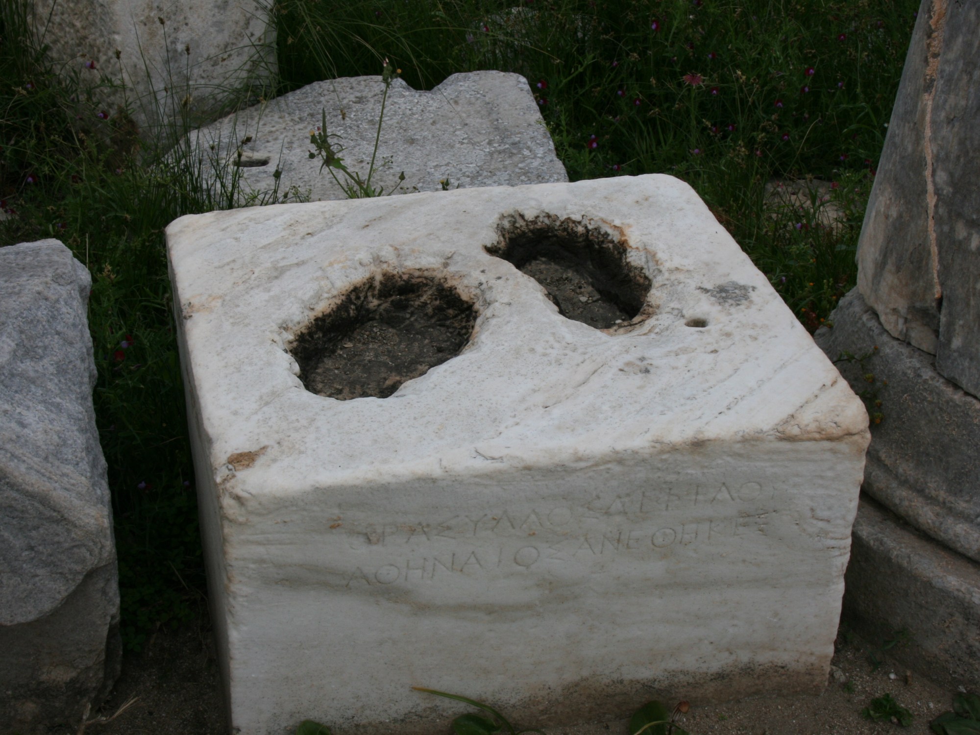 Photo: Délos, cuvettes de scellement de statue. (c) tous droits réservés à GP.