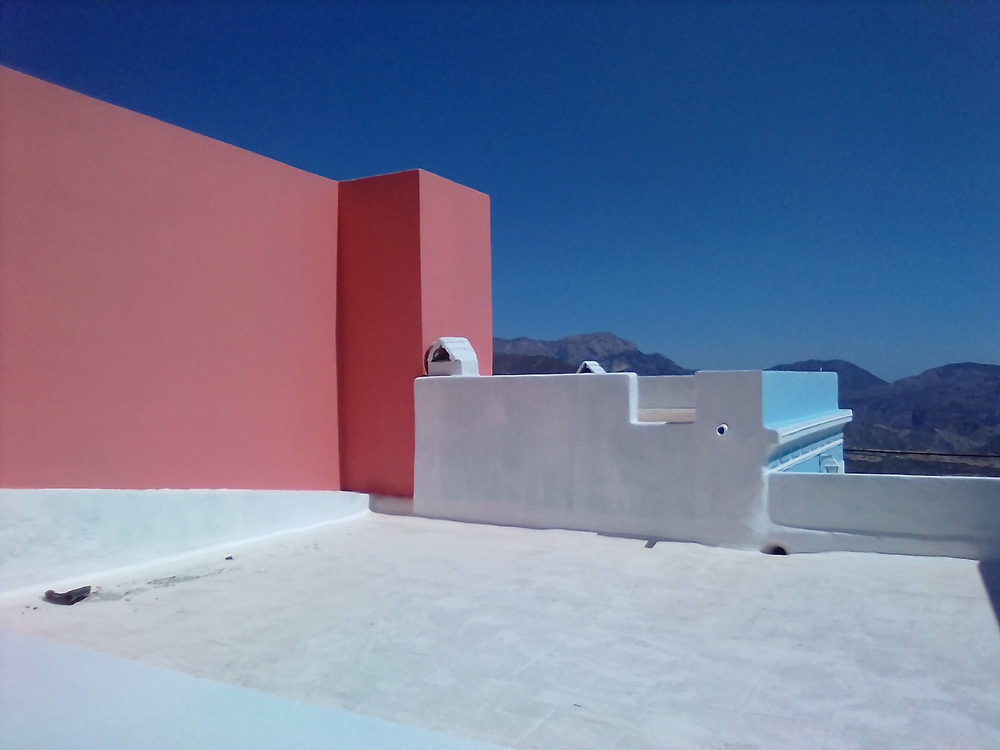 Arrivée avec armes et bagages au très joli village d’Emborio dans l’île de Santorin où j’ai loué un gîte traditionnel baptisé d’un nom mystérieux et dépourvu d’adresse. J’avais imaginé qu’il serait très facile à trouver et j’avais tort ! Après avoir fait 3 fois le tour de la place, évité des marches, des sens interdits et des ruelles trop étroites pour passer en voiture et m’être garée avec difficulté, je commence à me renseigner par les canaux habituels : boulangerie, petite supérette, bureau de poste, dame étendant du linge dans son jardin, motocycliste pétaradant et pope entre deux églises… Mais personne ne connait le nom de cette maison, pas plus que son emplacement et encore moins la propriétaire qui, vivant à l’étranger, a dépêché sur place Popi. La plate-forme de réservation en ligne n’a donné aucun contact téléphonique avec le loueur, sans doute a-t-elle peur que j’aille jeter un cocktail molotov dans son jardin ou perpétrer un attentat de la pire espèce contre ses arrière-neveux ? Avec pour tout contact une adresse mail qui ne sera peut-être consultée que le surlendemain dans le meilleur des cas, je continue mon errance dans les ruelles en brandissant la photo de la maison que j’ai pris soin d’imprimer, jusqu’à ce que je rencontre et aborde Yorgo. C’est un type sympa qui va me consacrer 2h et demie de son temps, arpenter rapidement les ruelles, les rampes et les escaliers, me conduire jusqu’à l’église et scruter avec moi le moindre indice depuis le parvis qui domine le bourg d’Emborio. Finalement j’aperçois la maison légèrement en contrebas du rempart. Je la reconnais grâce à mon papier qui commence sérieusement à se gondoler. Yorgo est perplexe, il ne voit pas du tout comment s’y rendre. Nous repartons dans les ruelles, ça monte, ça tourne, ça descend et nous arrivons au pied de la terrasse bleue mais il n’y a pas d’entrée. J’avise une voisine qui nettoie des légumes sur une table de jardin, elle ne sait pas comment on va dans cette maison au-dessus de la sienne… Ca commence à devenir un truc de fou ! Encore des marches, puis un sentier terreux, un âne et des poules dans un jardin et, finalement, par un petit portail bleu nous entrons dans la cour… Personne ! Là Yorgo se déchaîne, il téléphone à je ne sais qui, je l’entends parler et même crier assez fort en allemand puis il me dit avec un sourire: « Popi est à l’église ». Tout mon corps se révulse, oh non ! Moi, je ne refais pas le chemin inverse, je m’affale de tout mon long sur la petite terrasse ! Yorgo rit : « Non, elle arrive! » Il devrait y avoir plus de Yorgo dans ce vaste monde…