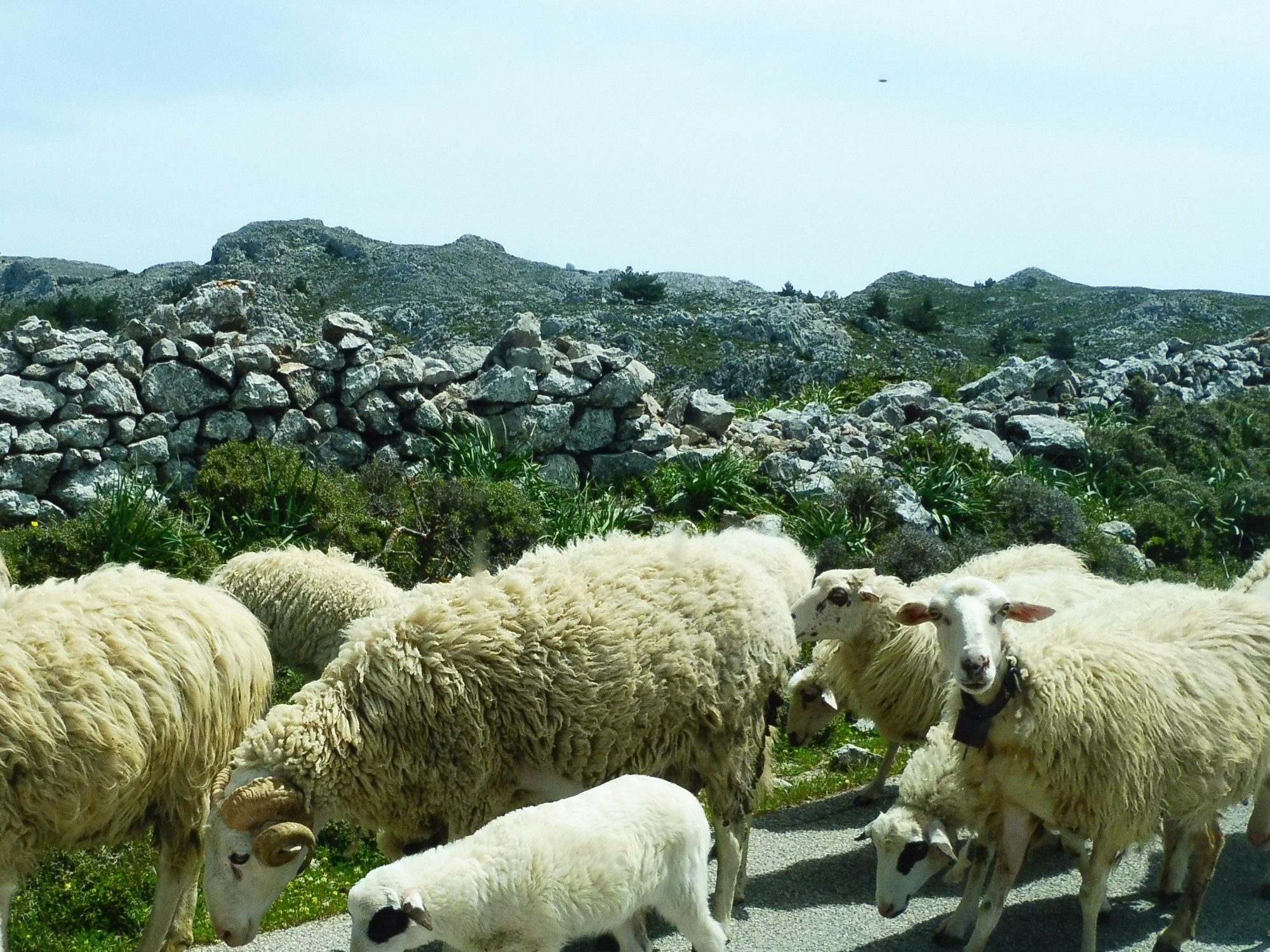 …c’est du moins ce que mes étudiants ont craint l’espace d’un moment ! Je forme avec quelques-uns d’entre eux l’arrière-garde d’un groupe assez fourni revenant de Lato. Au détour de la petite route de castine qui mène et ramène du site archéologique vers Kritsa, me voilà quasi alpaguée par un Crétois en costume traditionnel : braies noires, gilet, coiffe à franges et doté d’une belle paire de moustaches ! Ca ne date pas d’hier, disons d’avant-hier … Me voilà en train de discuter, de parler de la pluie et du beau temps et justement le temps passe… L’avant-garde est déjà arrivée depuis longtemps sur le parking, les étudiants qui sont avec moi s’impatientent, me font des signes et moi, je tente comme je peux de me libérer de mon berger qui s’approche lentement de moi et me regarde droit dans les yeux. Cette fois-ci c’en est trop ! Mes étudiants prennent peur… de quoi exactement ? Je ne sais pas : du grand couteau passé dans la ceinture du berger et de celui qui dépasse de sa botte, de son air farouche, de son intonation qu’ils ne comprennent pas ? Moi, je n’ai pas peur du tout : le berger me parle de sa fille qui a des chambres à louer et je crois que c’est surtout son business qui l’intéresse, les couteaux sont toujours sagement rangés, le regard est avant tout normal pour un vieux Crétois qui manifestement s’ennuie avec ses moutons et a envie de discuter. Et puis, il a au moins 30 ans de plus que moi, des dents en mauvais état et il dégage une forte odeur de mouton … A ma grande surprise, je vois mes étudiants détaler au plus vite et revenir 3 minutes plus tard avec mon mari toujours au pas de course ! J’ai envie de rire, mais mon vieux berger, lui, ne rit pas. Il a bien compris la situation et il est vexé ! Il s’éloigne lentement et retourne à ses moutons et moi aux miens… A chacun son troupeau !