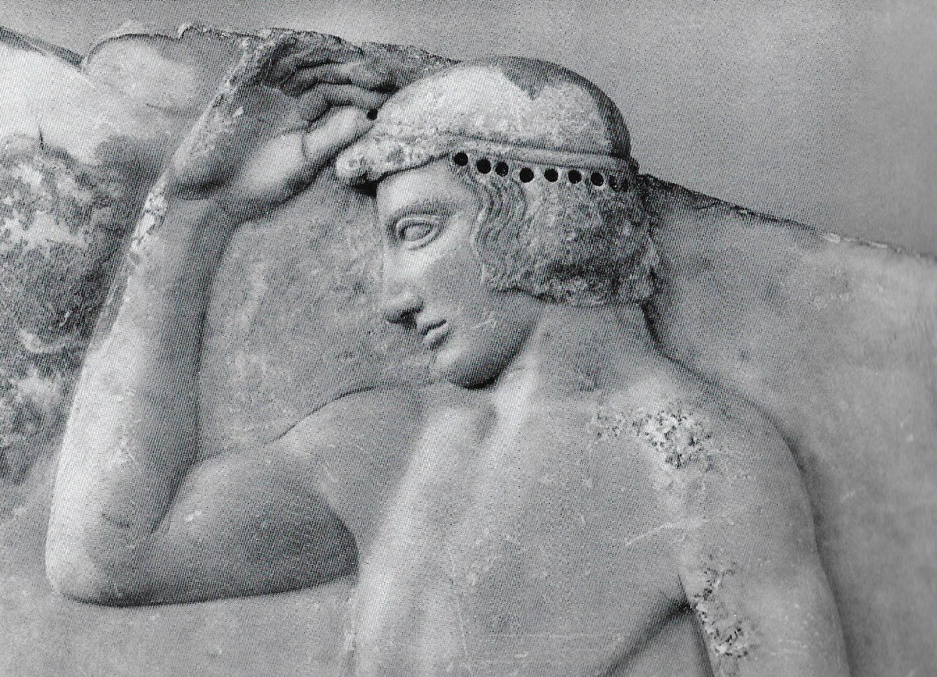 … dans les statues anciennes ? Première constatation, ces petits trous sont réguliers, peu profonds et pratiquement toujours situés sur la tête des statues. Deuxième constatation, ils semblent dater de la même époque que la sculpture. Troisième constatation, alors que certains sont sans rapport avec l’allure générale du personnage, d’autres sont dans le prolongement du geste de la statue. Quatrième constatation, puisqu’ils n’altèrent en rien l’entièreté de la représentation du personnage, ils ne peuvent être que des traces de rajouts en métal précieux (ou non) ajustés sur le marbre. Si on procède par élimination, le trou au-dessus de l’oreille de la femme représentée sur le Disque de Mélos est mal positionné pour être le point d’ancrage d’une boucle d’oreille, mais il peut tout à fait être celui d’un diadème ou d’un ornement de cheveux. Les neufs trous rangés régulièrement au-dessus du ruban, qui retient les cheveux de l’Ephèbe Victorieux du relief votif d’Athéna à Sounion, sont sans doute les points d’ancrage de la couronne de laurier offerte en récompense à tous les vainqueurs. Cette supposition est corroborée par la position de la main de l’éphèbe… Cette main dont la position évoque pour moi le geste familier de mon père rajustant son béret sur sa tête… Vous remarquerez que, au moment-même où je la formule, j’élimine cette hypothèse qui est quand même du grand n’importe quoi, j’en conviens …