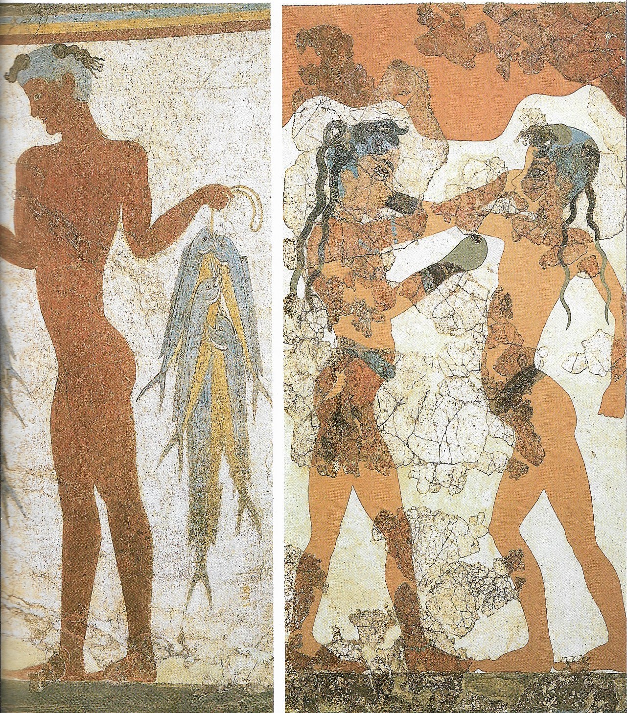 Le site minoen d’Akrotiri, tout au sud du croissant formé par l’île de Santorin, présente des fresques dont la fraîcheur et la vivacité étonne toujours. Leurs sujets s’inspirent de scènes de la vie quotidienne magnifiées par l’imagination et la fantaisie des artistes. Les jeunes pêcheurs de la maison ouest en sont une bonne illustration. Deux jeunes garçons, ainsi que l’attestent leurs corps sveltes et pas encore formés, sont nus et ils exhibent fièrement des chapelets de poissons enfilés sur des bâtons. La torsion et la position des corps, ainsi que l’œil de face sont complètement irréalistes. Ces garçons ont une curieuse coiffure, avec la tête rasée et ci et là des mèches de cheveux très longues. On a l’impression qu’ils portent une sorte de bonnet de bain percé pour laisser passer des dreadlocks… Clin d’œil à la modernité que l’on retrouve également sur la fresque des enfants boxeurs figurés en pleine action, dans la pièce B1, avec la particularité de ne porter qu’un seul gant de boxe à la main droite qui frappe, alors que la gauche sans doute esquive. Les similitudes entre ces deux fresques sont nombreuses : même coiffure /bonnet, même nudité, formes enfantines, œil en amande quasi égyptien, du moins oriental …