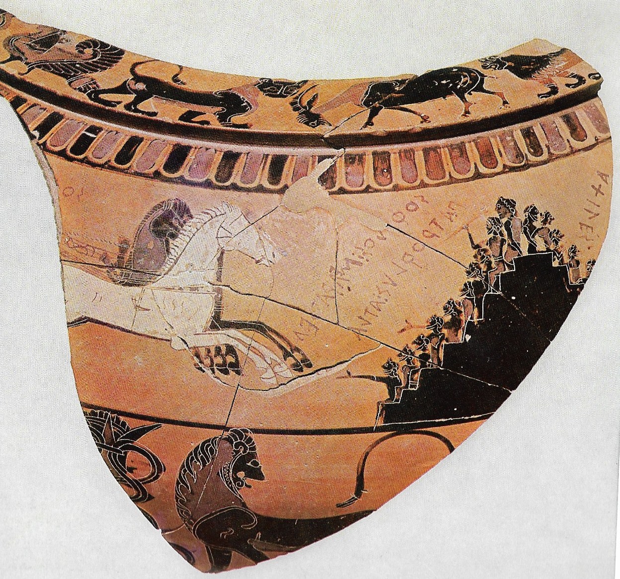 Ce fragment de vase en céramique rouge à figures noires et blanches, datant de l’époque géométrique représente dans la partie renflée de la panse une scène de jeux. On a pu déterminer qu’il s’agit des jeux funèbres en l’honneur de Patrocle. Sur le col des cerfs broutant, un sphinx, un avant de tigre sans doute … et vers le pied à côté d’un fer de lance tout en volute un drôle d’animal, peut-être un lion… Bref des animaux qui n’ont rien à faire avec la scène centrale et qui sont là pour faire du remplissage, tout beau et agréable qu’il soit ! La curiosité de ce vase n’est pas là, ni dans le quadrige qui galope. Seules deux têtes de chevaux apparaissent, mais le nombre de pattes nous renseigne sur leur nombre. On n’en verra pas davantage sur le fragment. Qu’est-ce qu’il a donc de curieux ? Les spectateurs sont regroupés en rangs serrés sur une tribune pleine et de couleur noire. Ils sont passionnés : certains sont debout et semblent invectiver chevaux et cavaliers, d’autres lèvent les bras. Jusque là rien de nouveau sous le soleil ! Mais ce qui me frappe et me fait soudain rire, c’est que la tribune est jumelée avec une autre, identique et symétrique, où les spectateurs s’agitent de la même façon … Est-ce que les supporters sont suffisamment idiots pour applaudir une scène qu’ils ne peuvent voir puisqu’ils lui tournent le dos ? Y aurait-il deux courses en même temps ? Les Grecs de l’Antiquité n’étaient pas plus bêtes que nous le sommes et on ne voit pas comment il pourrait y avoir deux courses en même temps puisqu’il n’y a qu’un anneau de course dans le stade … Le peintre était-il particulièrement facétieux… N’en était-il pas à une incohérence près ? Avait-il bu un petit coup de trop ? J’élimine tout de suite la dernière hypothèse car le trait est sûr, on voit que sa main n’a pas tremblé… J’élimine également la seconde car il n’y a pas incohérence dans cette scène bien construite, tout au plus de la bizarrerie. Je pense qu’il a fait courir sur tout le pourtour du vase la course de chevaux et que, confronté à la position de la tribune qui par définition est stable, il a imaginé de la doubler pour qu’on puisse lire la scène de n’importe quelle face du vase. Les spectateurs doivent être exactement les mêmes, d’un côté vus de leur profil gauche et de l’autre côté, vus de leur profil droit. Donc, je confirme : « Oui, le peintre était particulièrement facétieux et imaginatif ! »
