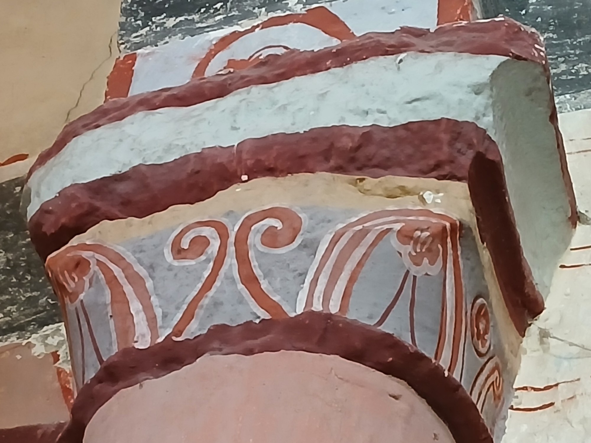 … a quelquefois de quoi surprendre. Dans l’église d’un village du Bourbonnais, par ailleurs célèbre pour ses peintures murales, un chapiteau « corinthien » attire mon attention et prouve la débrouillardise des décorateurs : quand on n’a pas de marbre, on a du beau calcaire et quand on n’a pas de beau calcaire, on a de la peinture ! On est très loin des rinceaux, des palmettes et des feuille d’acanthes, mais ces approximations successives ont quelque chose de touchant. On ne peut s’empêcher de penser au peintre et aux raisons qui l’ont poussé à opter pour cette décoration déviante : abus de l’ancêtre du vin de Saint-Pourçain ? Grève obligeant un apprenti débutant à terminer le travail ? Crise soudaine de fantaisie ? Vengeance envers un moine ? Il n’empêche que l’apprenti-débutant-fantaisiste-vengeur a eu le souci des feuillages d’angle, ce qui n’est pas facile quand on a bu un petit coup de trop !