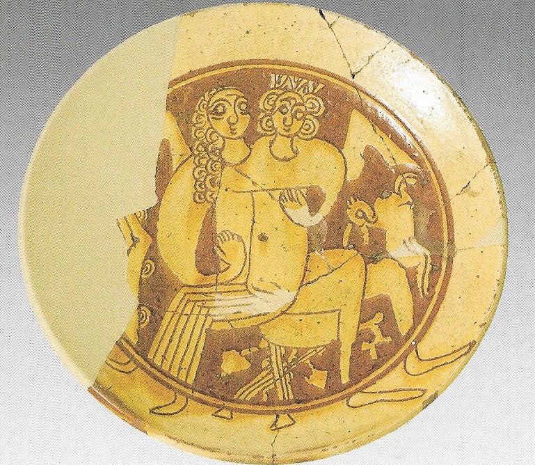 Ce plat byzantin en terre-cuite partiellement reconstitué, peint en ocre et datant du +XII°, a été retrouvé sur le site de l’Ancienne Corinthe. Il représente le héros mythique grec Digénis Akritas – l’akrite c’est-à-dire le garde des frontières orientales de l’empire- dans une scène touchante. Quant on parle de Digénis Akritas, en général on est dans l’hyperbole, c’est le héros qui combat 100 guerriers, qui court plus vite que les chevaux… etc … Mais ici, nous avons une scène familière et naïve qui le représente dans une posture affectueuse réservée d’ordinaire à la vie privée. On n’imagine pas vraiment ce pourfendeur de guerriers arabes assis sur un tabouret, dont le piètement en X richement orné atteste qu’on est plutôt dans un palais que sur le champ de bataille, et enlacé avec une princesse signalée par sa couronne. Peut-être sont-ils dans le palais magnifique qu’il habite sur les rives de l’Euphrate ? Tout concourt à la naïveté de la représentation : au niveau du marli, le double trait qui encadre la scène est franchi par les pieds des personnages et du fauteuil, qui n’ont pas trouvé de place dans le cercle central ; le décor de montagnes, qui vient combler l’espace de part et d’autre des personnages, réduit en pointes enneigées ; la robe de la princesse figurée par des traits parallèles et ce nombril incongru qui semble suggérer que la demoiselle est à moitié nue ou du moins qu’elle porte une robe transparente. Beaucoup de maladresses également dans le dessin : On ne sait pas vraiment comment sont positionnés les personnages sur le fauteuil ni comment la princesse tient sur les genoux de Digénis, elle a l’air comme suspendue dans une position inconfortable et glissante ; les mains recourbées en griffes sont reliées directement aux bras, traités en amas compacts depuis le cou ; les chevelures en boucles tombantes pour Digénis et retenues en ondulations ordonnées pour la princesse. Malgré tous ces bémols, la scène est attachante et même touchante : le traitement original du héros qui ne combat plus mais se repose, l’affection des amants révélée par l’embrassement étroit des personnages, le caractère confidentiel de la scène, la symétrie de la représentation, et n’oublions pas les yeux énamourés de Digénis et de sa princesse ! Par-delà les massacres et les razzias, Digénis était donc capable de faire les yeux doux à sa belle …