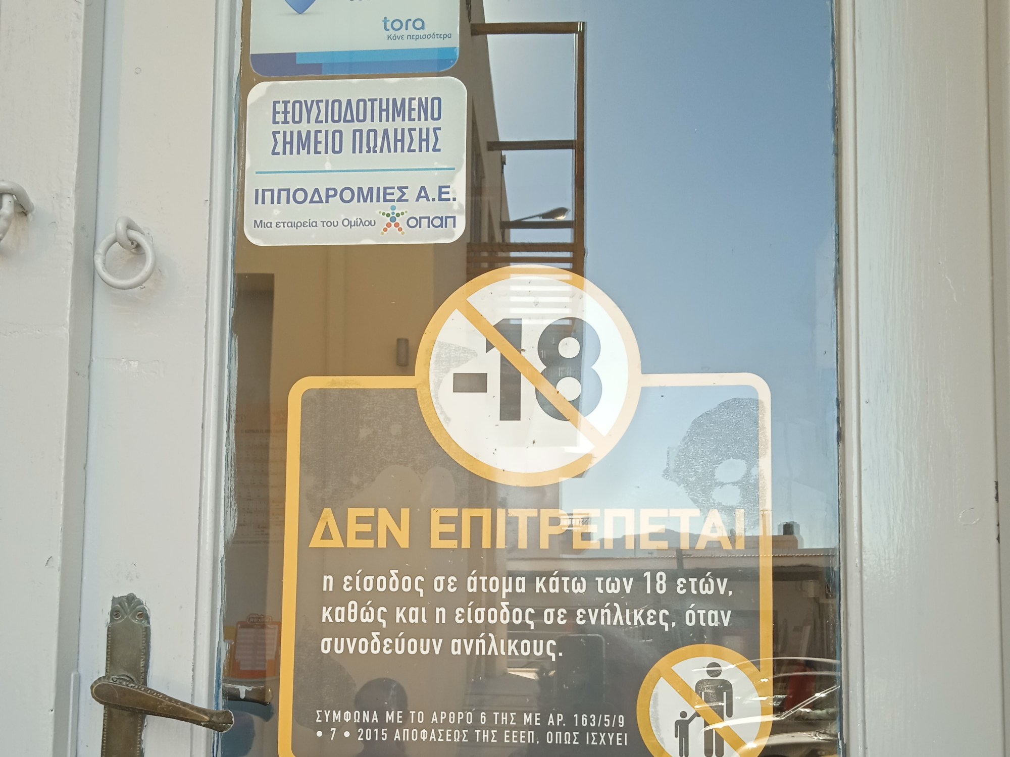 A l’entrée d’une porte assez banale dans une petite ville grecque, plusieurs autocollants nous rappellent à l’ordre et un panneau se fait plus explicite :