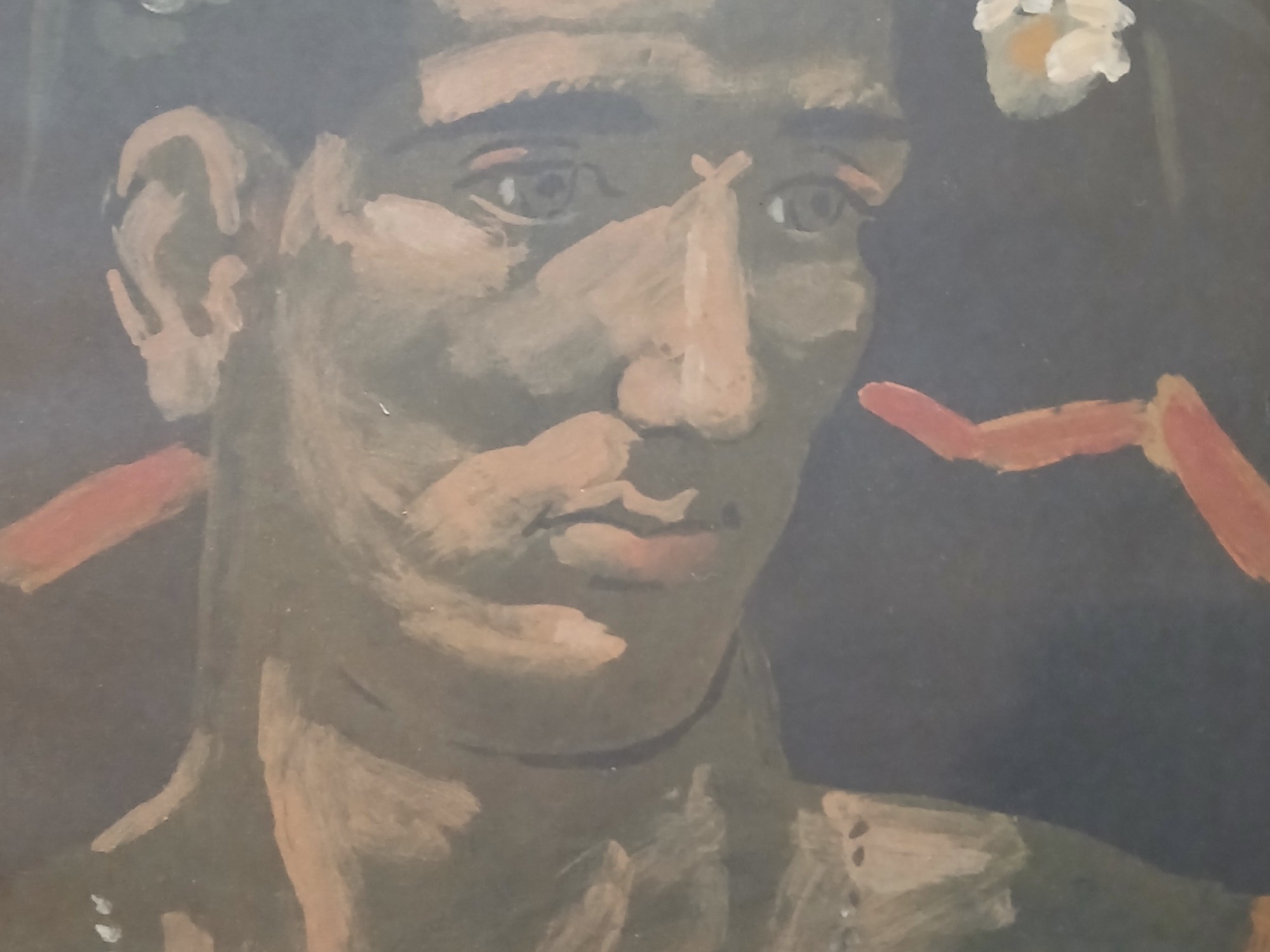 Plus je regarde ce visage d’homme, tableau à l’acrylique sur papier peint en 1967 par Tsarouchis, plus je lui trouve des ressemblances troublantes avec des œuvres de la statuaire antique : une musculature exacerbée au niveau du cou et des épaules, la tête légèrement penchée sur le côté, la bouche bien formée, le nez droit et jusqu’aux boucles de cheveux bien rangées sous une couronne évoquée par un trait ocre au-dessus de la tête et deux petits bouquets de fleurs. Bien sûr certains points nous emportent bien loin de l’idéalisme du –V° siècle : un maillot ouvert à l’encolure, un collier fin et long, les rides et les sillons profonds du visage et surtout un regard perdu dans le vague, certes comme celui des statues antiques mais triste, infiniment triste… bref, un Apollon déprimé ! Mais le titre du portrait nous détrompe : Σπουδή για το μήνα Μάιο, Etude pour le mois de Mai … Le 24 avril 1967, trois colonels grec ont pris le pouvoir et mis en place un régime fasciste dans le pays. Il y avait bien de quoi être triste …