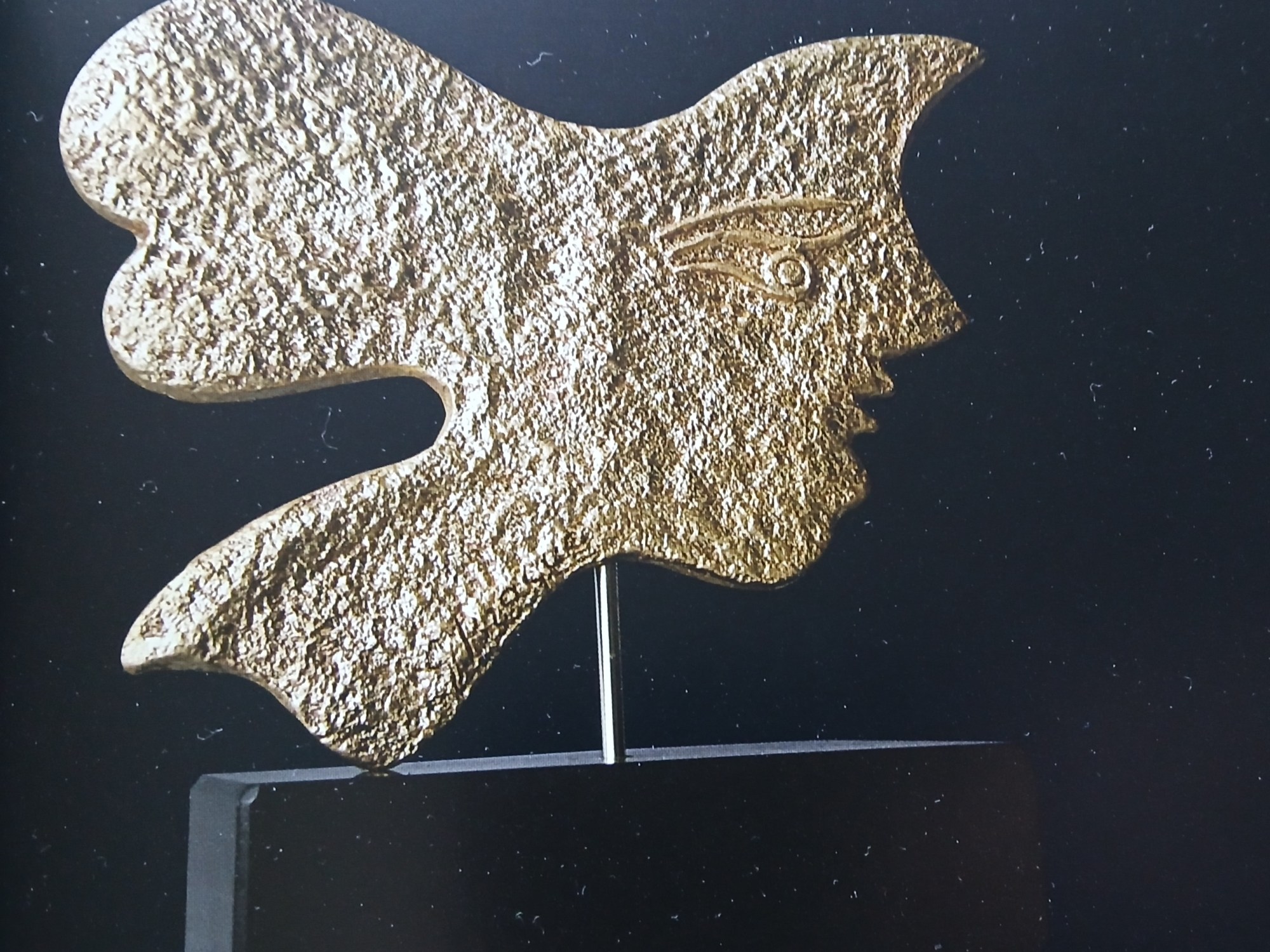 est une petite plaque de céramique rugueuse qui peut s’inscrire dans un carré de moins de 30 cms de côté. Un relief important et inhabituel dans les représentations mythologiques crépit la chevelure, le cou et le visage du personnage féminin. Ils sont en quelque sorte « avalés » et dissimulés par une gangue granuleuse impersonnelle qui déshumanise le personnage. Cette rugosité évoque davantage la truelle du maçon que le pinceau du peintre ou la main du céramiste. Seuls dans cette croûte de terre cuite, des petits bourrelets en vermicelle tournant autour de l’œil sont là pour nous rappeler qu’on a affaire à un être humain. . . Un personnage féminin ? Tout en elle s’apparente à l’oiseau : le mouvement du cou tendu dans une migration lointaine, une coiffure suggérée plutôt que décrite au chignon instable figurant des plumes. La petite houppe de cheveux relevés sur le front, le nez en achevant la courbe et jusqu’à la bouche bizarrement coupée en trois lèvres au dessus du menton évoquent chacun un bec d’oiseau. Mais si je considère ces éléments dans leur ensemble, je vois encore un profil d’oiseau… Et si je regarde en même temps l’œil rond en relief, cette fois-ci je vois un oiseau de proie ! Cette Circé dont la réalisation a l’air bâclée, qui paraît négligée dans sa carapace, me paraît tout à coup très inquiétante …