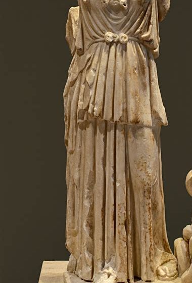 Lequel ? Le porte-manteau ou bien la jeune femme ? Eh bien je vous fais juge… Au tournant des VI° et V° siècles avant notre ère, il se passe « quelque chose » dans les représentations féminines de la statuaire… Si je regarde l’Héra Chéramyès de Samos, dont la cape est empesée avec des plis stylisés qui ne correspondent ni au corps du personnage féminin ni aux lois de la pesanteur, je me rends bien compte qu’elle a tout d’un porte-manteau ! Puristes de la statuaire grecque antique détournez le regard ! Ou bien convenez avec moi que cette Héra-là n’a rien d’une pin-up … Mais par la suite, il est évident que l’accent est mis à la fois sur les volumes, la souplesse et l’anatomie du corps ainsi que sur la coquetterie du vêtement. Le chiton de lin, qui est un vêtement de dessous, et l’himation de laine, qui est un vêtement de dessus, ont un plissé mieux rendu. Les habits s’assouplissent, de même que les visages qui désormais esquissent un sourire plus naturel, et leur disposition sur le corps épouse davantage les courbes et le mouvement. On ressent l’épaisseur des tissus, leur transparence ou leur opacité et presque les froufrous… Regardez maintenant l’Athéna Parthénos de Phidias…. Ce qui est bizarre, c’est que le corps en prenant de la vérité anatomique, des volumes et du naturel s’efface devant le vêtement. Ce n’est plus tellement le corps qui compte, mais l’habit presque seul !