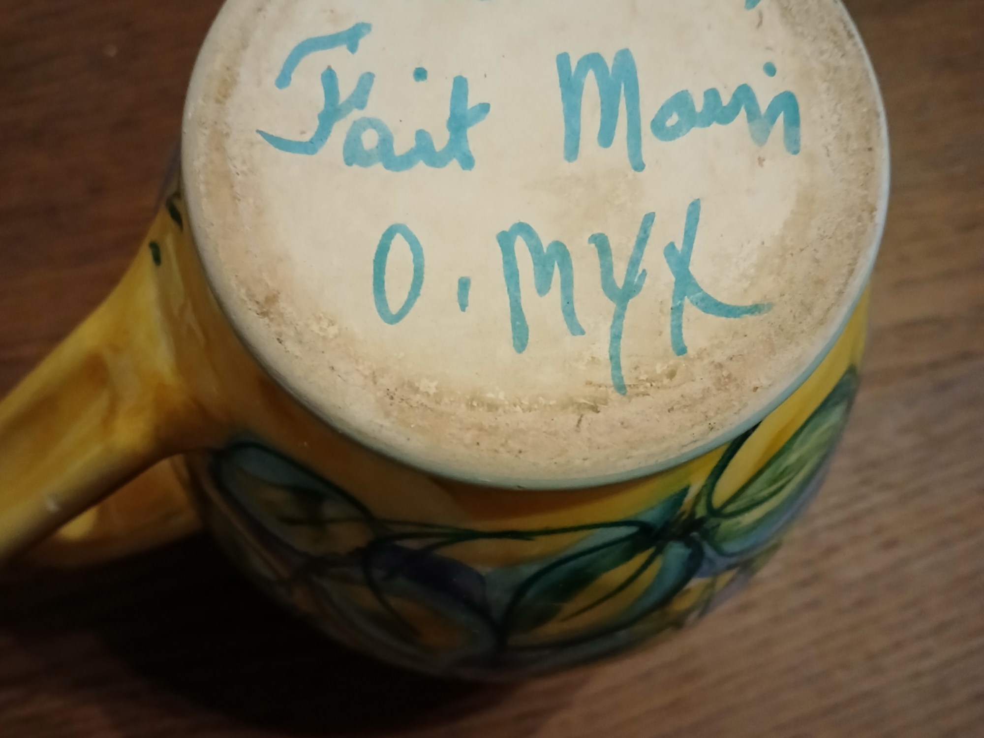 Je quitte le vide-grenier très satisfaite de moi ! J’y ai acheté un pichet signé Vallauris pour une toute petite somme. Il est magnifique : pas trop grand, pas trop lourd, l’anse bien positionnée et surtout des couleurs légères et fondues dans les bleus, les jaunes et les verts qui contrastent avec les couleurs très vives du style traditionnel de Vallauris … Et ce n’est pas tout, le céramiste a signé son œuvre avec des lettres grecques Ο Μyχ. Ce pichet était fait pour moi ! Je me lance dans une enquête : Qui est ce céramiste ? Un Grec sans doute ? Ou un philhellène ? Mais ce qui m’ennuie c’est que les lettres majuscules O, M, Y et X peuvent aussi bien appartenir à l’alphabet latin qu’au grec… la dernière étant soit un (x) soit un (ch) suivant la langue. Donc ai-je affaire à un « vrai » Grec ou bien à un fantaisiste qui signe avec des lettres pseudo-grecques ? Finalement j’adopte l’idée du « vrai » Grec et ceci pour une bonne raison ! C’est le O. (le = article masculin) qui n’a rien à faire dans la signature d’un fantaisiste et qui atteste qu’on a affaire à un Grec qui met un article devant son nom. Je consulte donc des listes de céramistes professionnels sur internet à la recherche de mon Grec de Vallauris. Et j’en trouve un… Ah zut ! C’est une femme qui s’appelle Κυριακή. Pas de Michel, Michalis, Mickaël … Rien ! Je feuillette des ouvrages spécialisés… Rien ! Il faut bien se rendre à l’évidence… J’ai bien un Vallauris, exécuté par un céramiste qui n’est pas répertorié, sans doute un Grec … En tout cas un inconnu épatant qui a décliné le style Vallauris tout en douceur et en beauté et quand je regarde mon pichet rempli d’eau sur la table, je me dis : « Ce gars-là c’est vraiment quelqu’un ! »