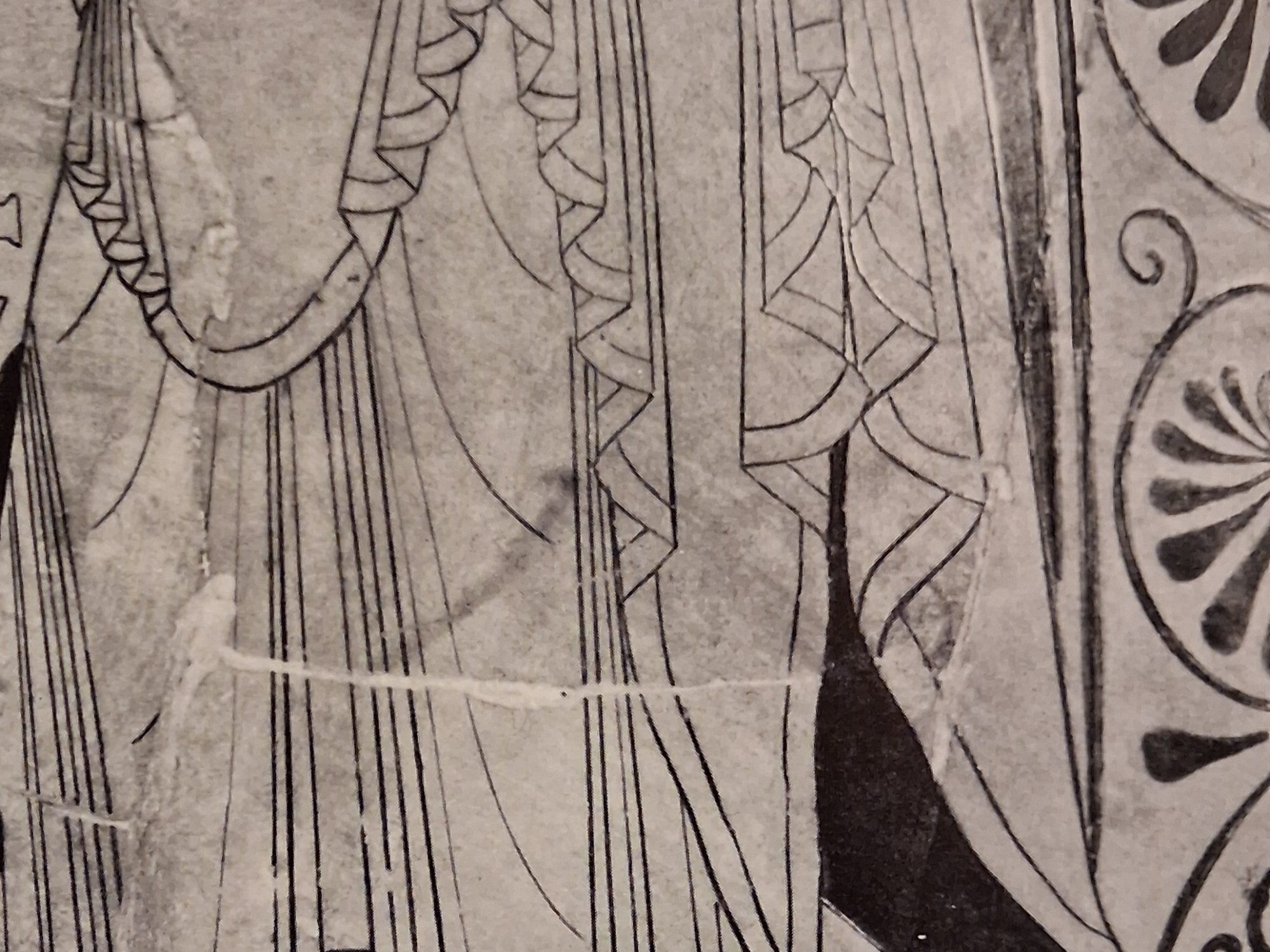 Quand on observe soigneusement les personnages dessinés sur la céramique, on se rend compte que leurs habits donnent une bonne indication de leur situation et de leur activité dans la société. Les servantes portent des robes simples et assez courtes, les voyageurs ont d’amples houppelandes à capuchon, les ennemis scythes et plus généralement les Barbares des pantalons collants et épais tissés avec des motifs géométriques, les athlètes sont nus ou bien vêtus d’un vêtement souple qui leur arrive en haut des cuisses et les femmes, déesses ou bien personnages mythologiques, ont des robes à froufrous ! Cette constatation est à modérer, car la dame a l’air dénudée. Vous croyez vraiment qu’Andromaque ou Hélène se promenait toute nue ? Sans doute que non. Alors pourquoi ces habits transparents ? Pas si transparents que ça en fait, car on ne voit pas vraiment leur corps ni leurs sous-vêtements… Cette pseudo-transparence m’apparaît plutôt comme un moyen de montrer que le tissu du vêtement est léger et précieux, tissé avec des fils fins et non grossiers comme ceux des servantes. Bref, qu’on a affaire à des dames de qualité qui n’ont pas les vêtements de tout le monde ! Je compte les couches successives qui les couvrent car le peintre a pris soin de leur donner une longueur différente, comme s’il voulait quand même nous signifier qu’elles n’étaient pas vraiment nues mais portaient jusqu’à … 4 épaisseurs. Je veux bien croire que le tissage est fin, mais juxtaposez 4 couches très fines voire transparentes et vous arriverez à l’évidence qu’on ne voit plus rien à travers !