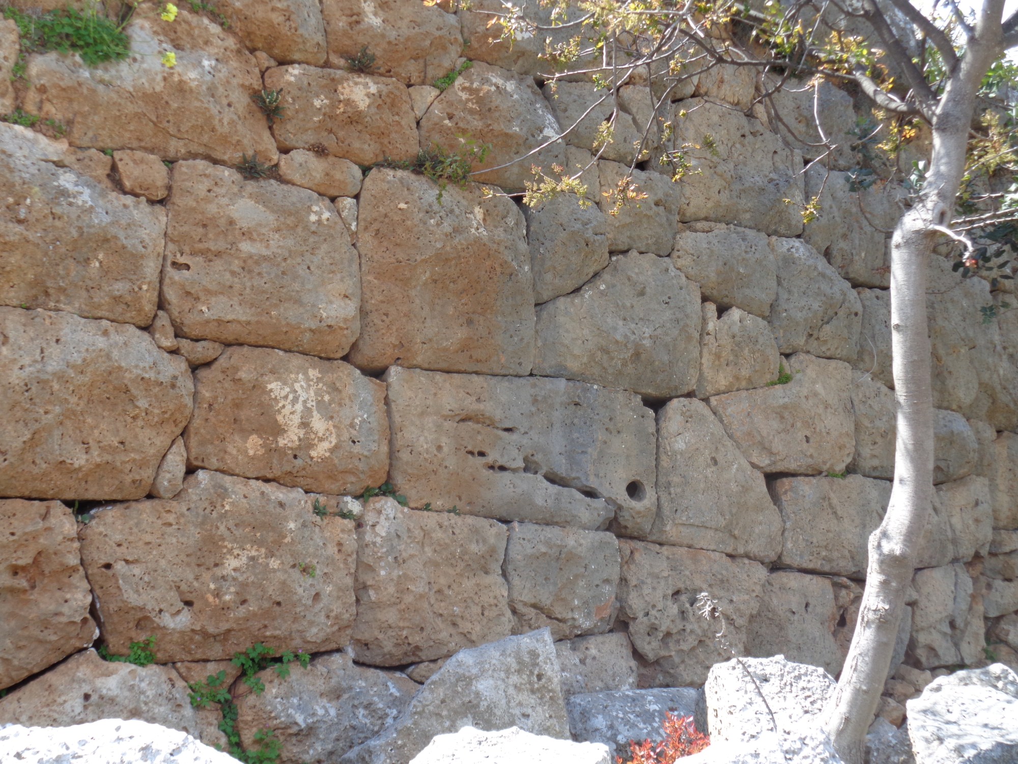 …il y en a partout et presque à toutes les époques de l’Antiquité ! On est habitués à ceux que l’on voit à Mycènes, mais il en existe ailleurs, par exemple à Lato en Crète. Et pourtant le site de Lato ne date que du –V°… On est bien loin du –XIV° de Mycènes ! Les pierres énormes encastrées les unes dans les autres ont fait sans doute partie des techniques usuelles de construction pendant l’Antiquité. L’appareil du rempart de Lato est plus grossier, moins bien structuré, entre les gros blocs il y a un peu de remplissage… Mais ce n’est pas un palais royal ! De plus, l’accès au site encastré entre les montagnes est difficile depuis l’étroite plaine de Kritsa encadrée elle-même par les montagnes. A Mycènes une grande plaine longe la colline escarpée du site et permet le transport des pierres sans doute venues d’ailleurs. A Lato, on a tout trouvé sur place et on a fait du cyclopéen avec ce qu’on avait à disposition !