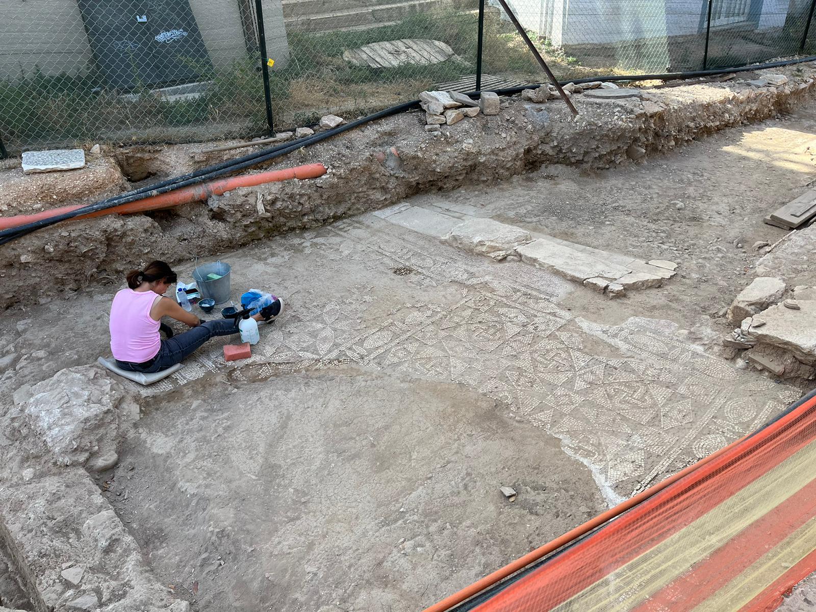 Vous me direz : « Qu’est-ce que vous en savez ? » Et je vous répondrai : « Je le sais, parce que tout dans sa posture me le montre» : épaules basses, bras tendus, jambes écartées à cause des crampes, dos courbé, petit coussin pour amortir les douleurs des muscles fessiers. Bien sûr il y a une belle mosaïque à découvrir et peut-être à sauver, mais autour sous le cagnard et la poussière ce sont les moustiques, les voitures qui passent, les gravats, les tuyaux, les grillages… Qu’est-ce que c’est moche ! A côté d’elle, la panoplie de celui qui creuse : seau, sac poubelle, éponge de chantier et jerrican d’eau pour nettoyer un peu tout ça… Et encore à côté, le vademecum nécessaire : petite bouteille d’eau minérale, téléphone protégé au minimum sur un journal. Et finalement tant que les tessères ne sont pas nettoyées, tant que la terre ou le ciment qui les recouvrait n’est pas totalement éliminé, la mosaïque on ne la voit pas bien et même peut-être pas du tout … Bien sûr on distingue des poissons, des rosaces et des croix compliquées mais surtout des trous, des arrachements, des tessères qui se baladent et qu’on ne sait pas replacer à leur endroit d’origine. De quoi, si on osait, ficher un bon coup de pied dans tout ce fatras ! Quand nous admirons les superbes mosaïques dans les musées, ayons une petite pensée pour les archéologues …